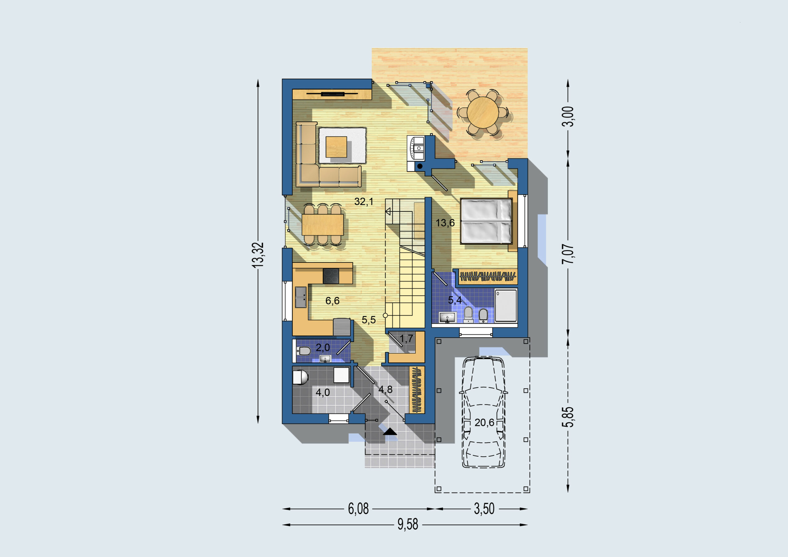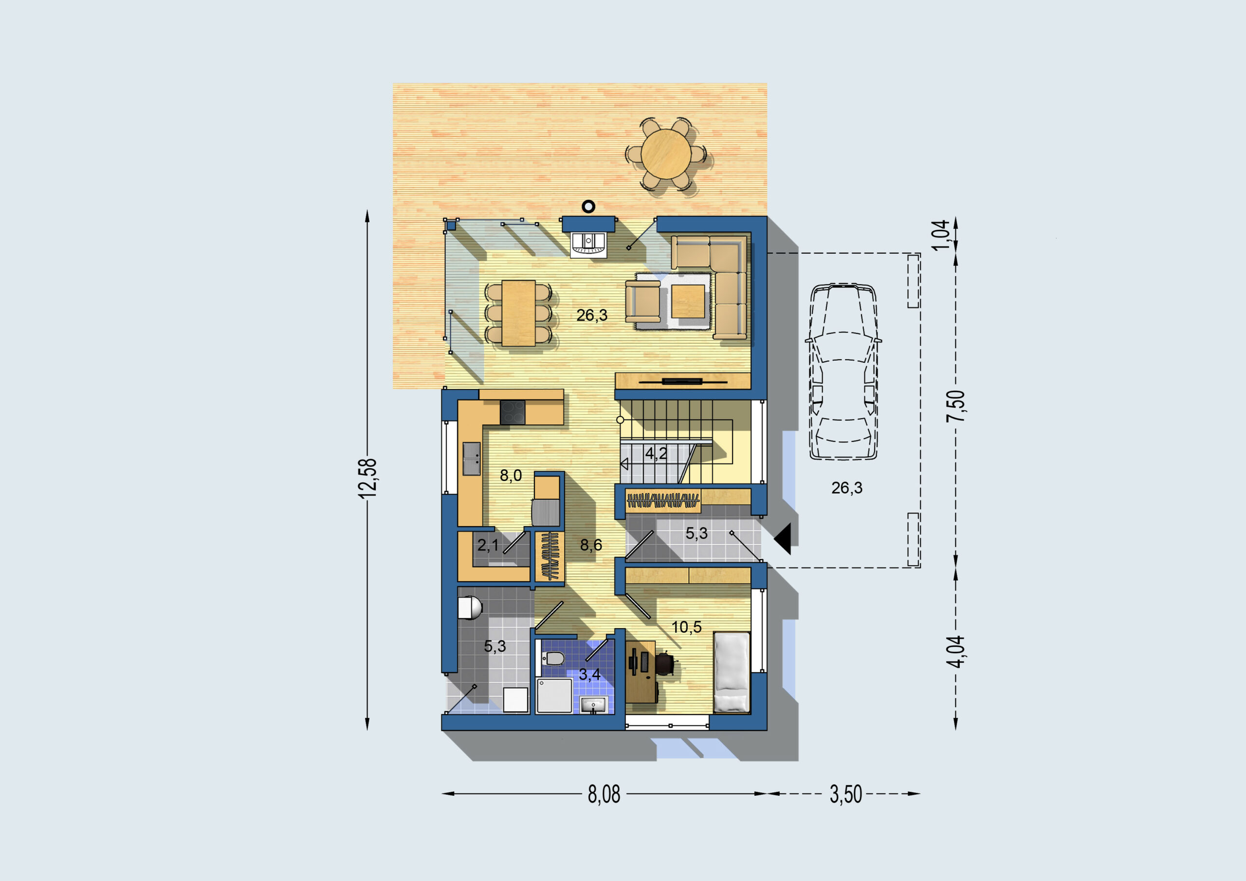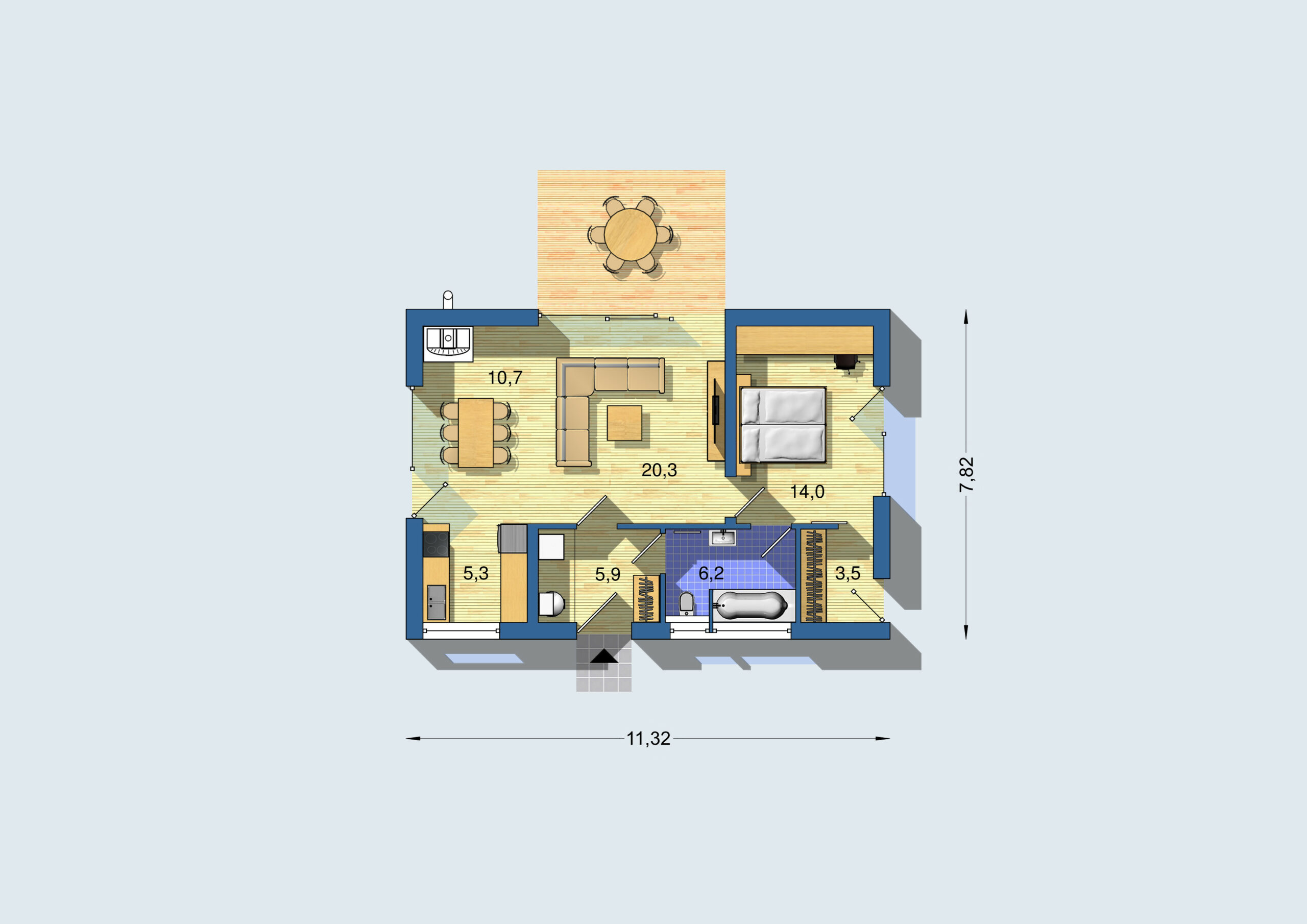 Tento dům je navržen s důrazem na ekonomickou efektivitu. Moderní a praktický dům navržený pro úsporu nákladů. Ideální volba pro rodiny hledající cenově dostupné bydlení s vysokou kvalitou a komfortem.